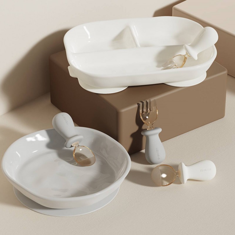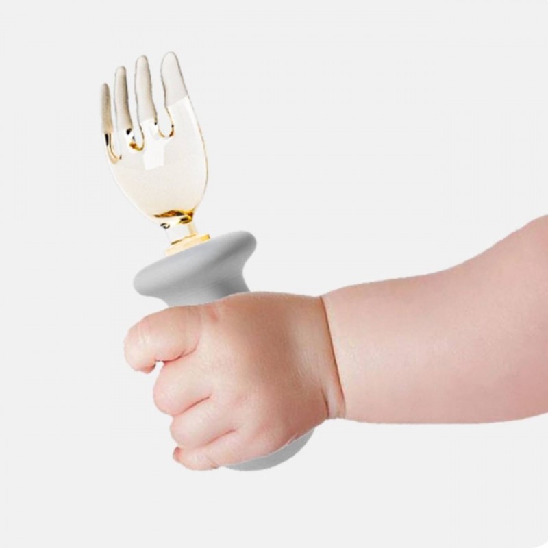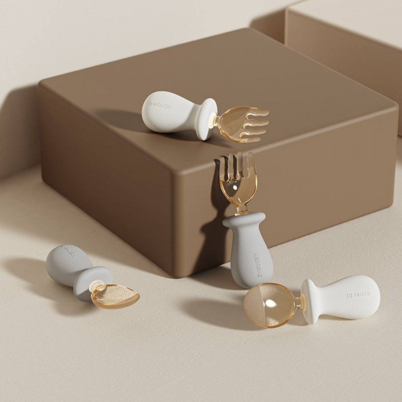 دستهٔ ارگونومیک و سیلیکونی این محصول، ضدلغزش است و به کودک کمک میکند تا به راحتی قاشق و چنگال را در دست بگیرد و مهارت خودغذاخوری را تمرین کند. سری پلاستیکی نرم و لبههای گرد آن به گونهای ساخته شده که به لثه و دهان حساس کودک آسیبی نرساند.