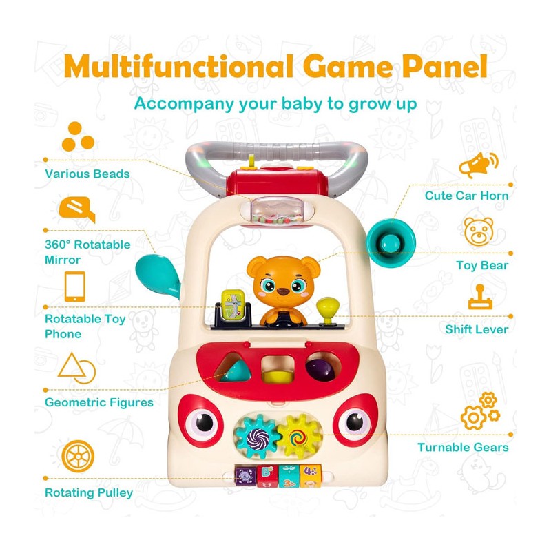 • پنل بازی موزیکال و آموزشی: شامل دکمههای پخش موسیقی، نورهای رنگی، چرخدندههای چرخان و بازیهای مهارتی که به تقویت حواس شنوایی و بینایی کمک میکنند.